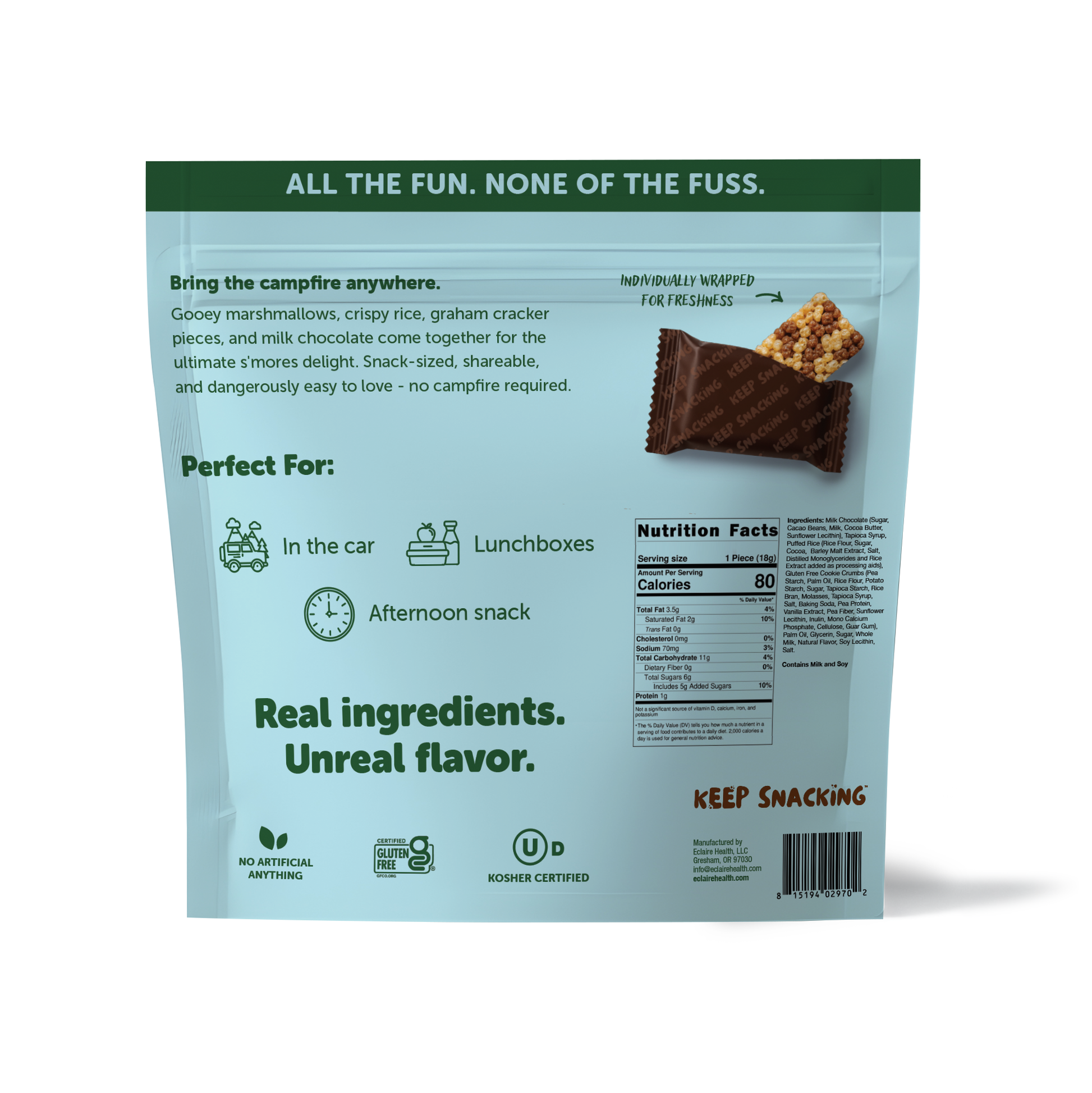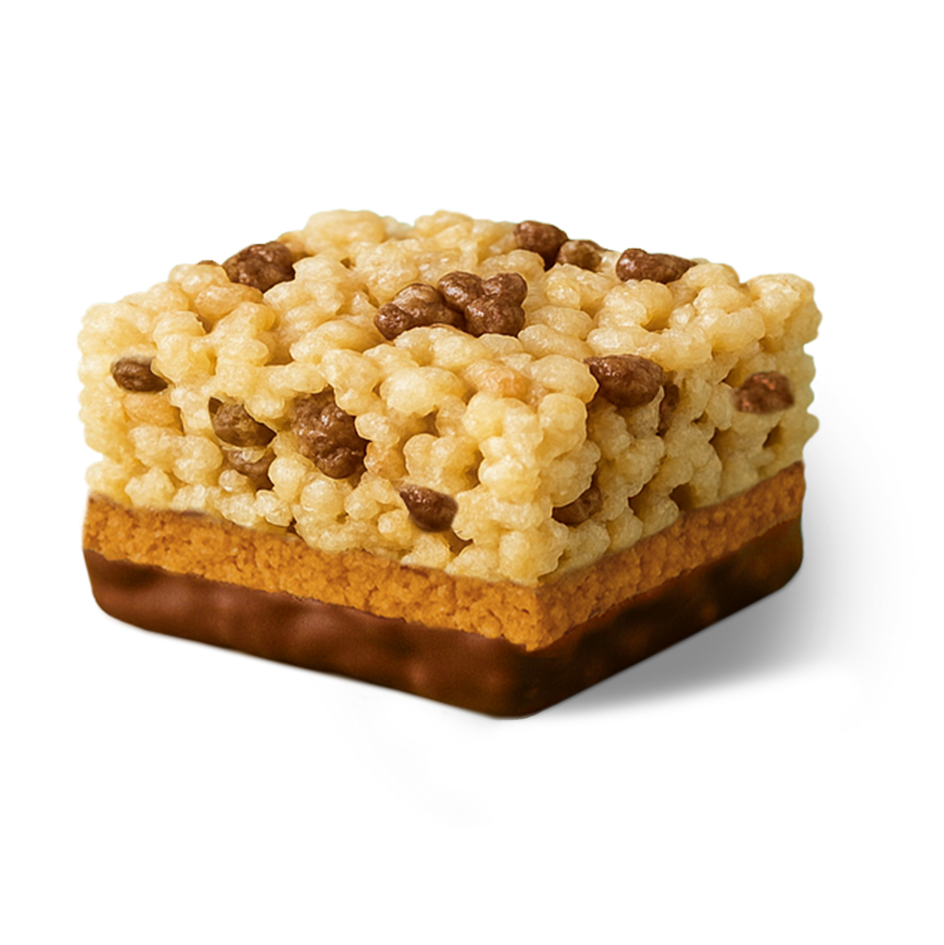 The campfire classic, minus the campfire. Crispy, gooey cocoa and vanilla puffed rice and marshmallow treat sitting atop a deliciously soft graham cracker layer and dipped in chocolate. Dangerously easy to love.